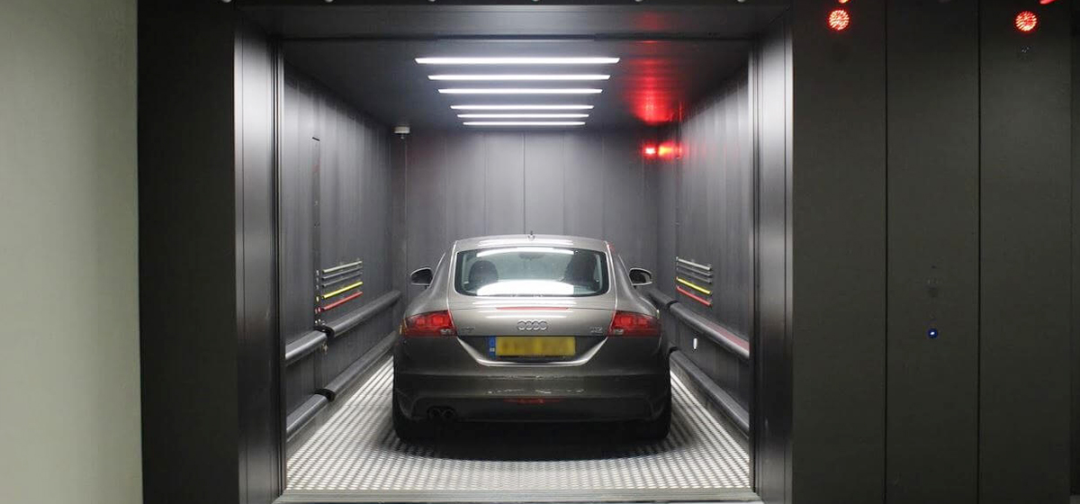 Montacoches con capacidad de 3 Ton en adelante, con baranda perimetral y puertas tipo guillotina accionadas por la misma plataforma o tipo talanquera manual, cuenta con sistema hidráulico.